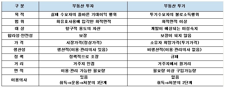 부동산투자와 투기의 개념규정은 어려우나, 투자·투기의 구별기준은 다음 사항이 포함된다.