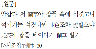 아깝다 저 蘭草야 잡풀 속에 섞였고나
