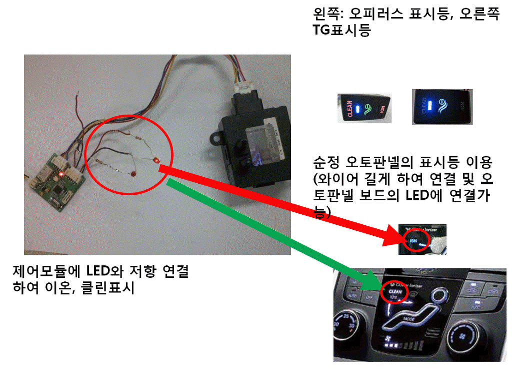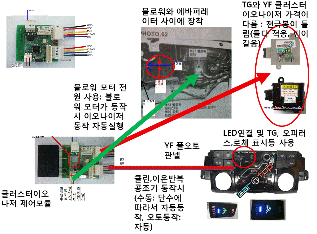 작성자와룡 작성자 본인 여부 작성자 작성시간 11.12.30 장착위치는 위 에바와 블로워 모터 사이입니다. 기존의 순정 표시기는 TG와 오피러스 로체등이 있으며,표시등 위치는 멍텅구리 스위치쪽에 붙어 있습니다. 요즘에 나오는 표시등은 오토판넬에 내장되어 있습니다.. 그래서 오토판넬의 순정품을 사용하면 좋을듯합니다. 오토판넬을 구입해야 하는 단점이 있으며, 표시등은 단순히 표시만 하는 기능이므로 LED와 저항만으로 연결하면 될듯 합니다. 배선은 클러스터이오나이저에 맞는 순정배선들이 있으니 연결하셔서 사용하면 됩니다. YF 배선은 하네스가 어떻게 생겼는지 모르겠네요. 가격이 문제일듯 합니다.