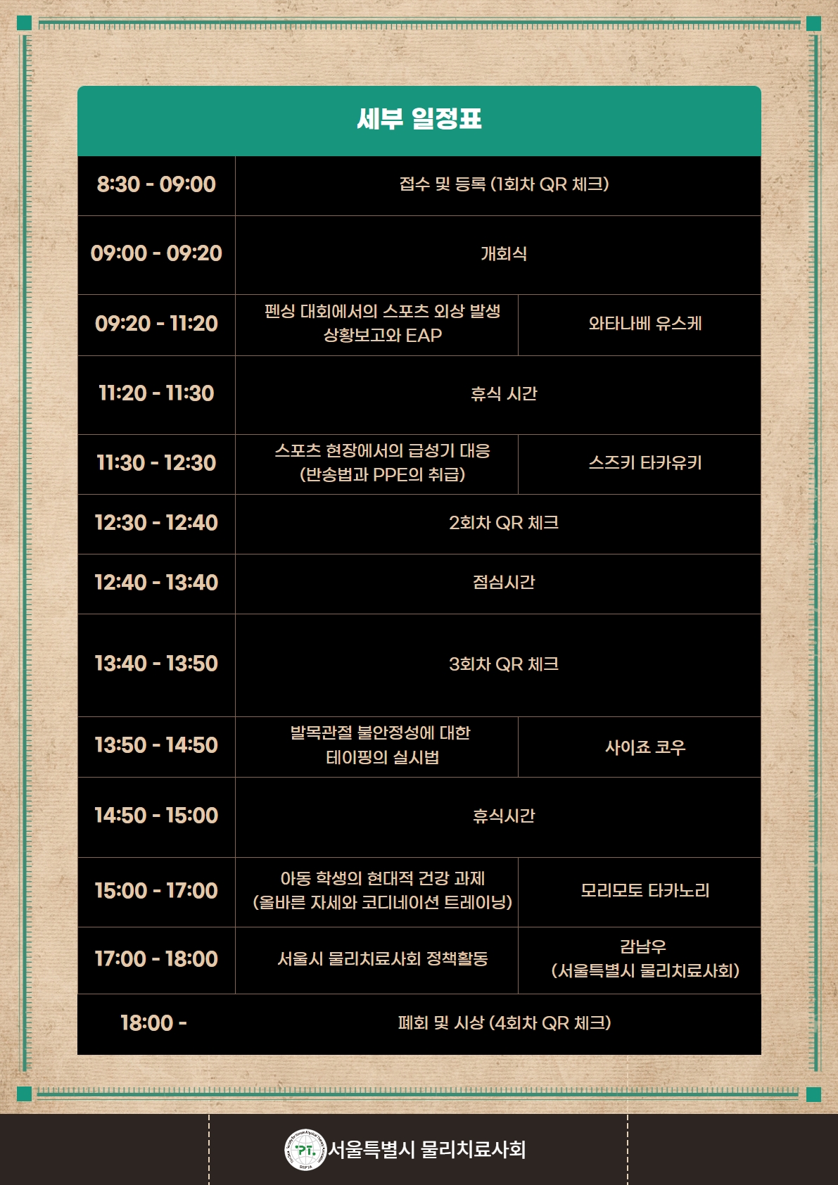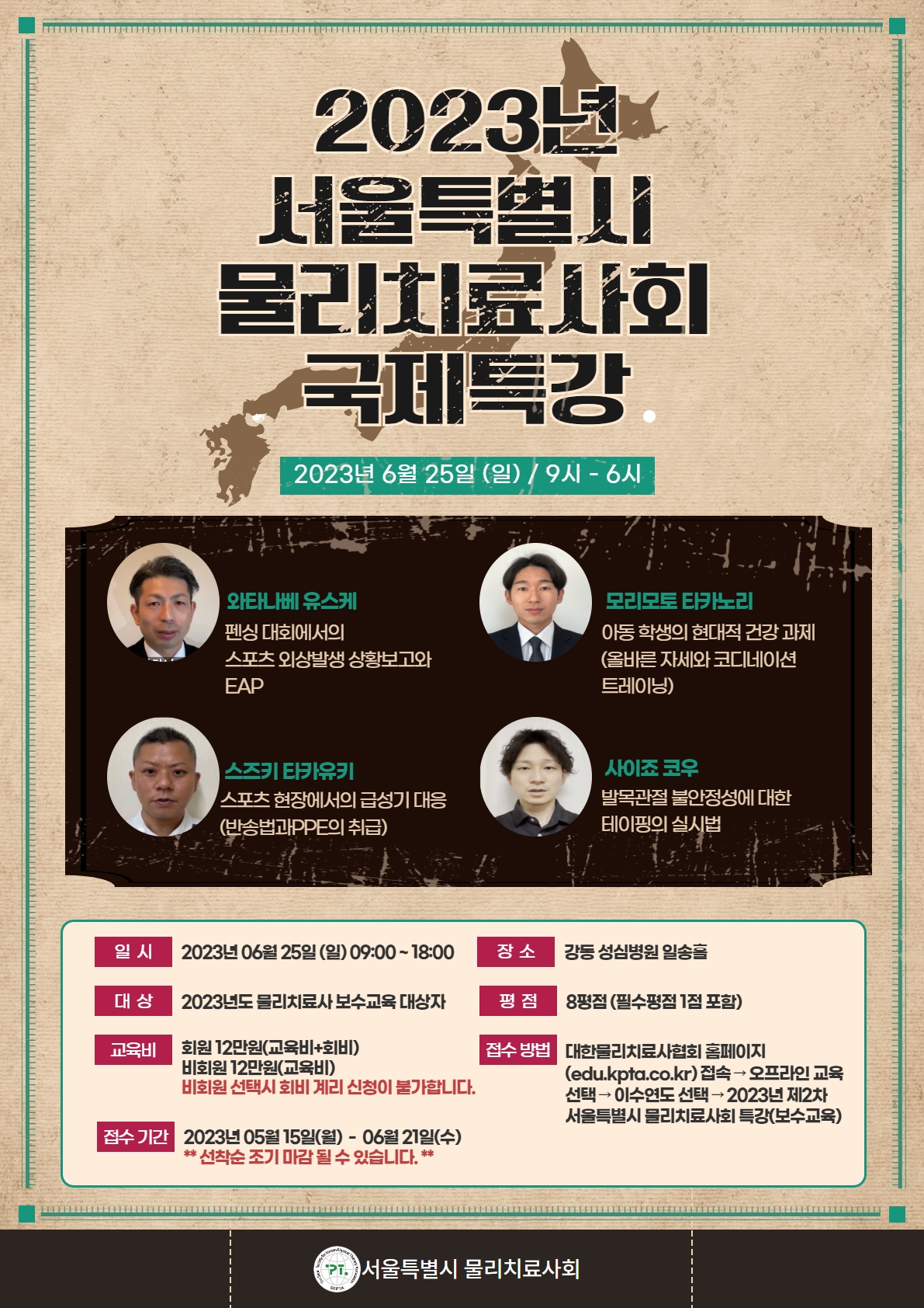 2. 본 시회에서는 2023년 제2차 서울특별시 물리치료사회 특강(보수교육)을 아래와 같이 개최하게 되었습니다.