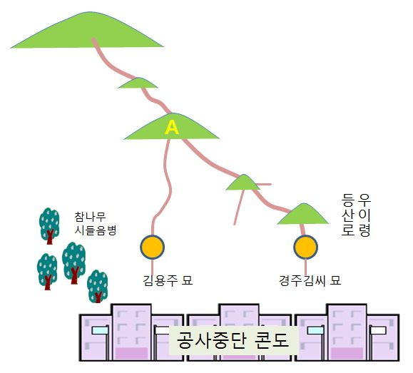 위 기사의 사진과 글을 보면 아마도 두 곳 모두 능선마루터기에 쓴 것으로 보인다. 특히 아래 사진을 보면 묘소 앞쪽이 솟아올라 계속 진행하는 것을 볼 수 있다.