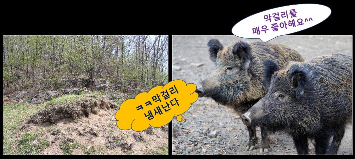 참고로 예전에 농촌에서는 멧돼지를 잡기 위해 구덩이를 깊이 판 후 막걸리를 놓아두면 멧돼지가 들어와 갇히는 경우도 있었다. 막걸리를 좋아하는 멧돼지 습성을 이용한 포획방법이다.