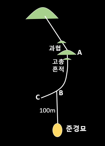 다소 의문이 가지만 용맥을 따라 계속 올라가면 비로소 작은 봉우리 A가 나타나고 뒤편에는 과협을 이룬 상태다. 이곳의 상태는 꽤 양호한 편이다. 그리고 봉우리 A 아래에는 묘를 쓴 흔적이 있으며, 이 산줄기는 C로 진행하면서 마감하고 있다.