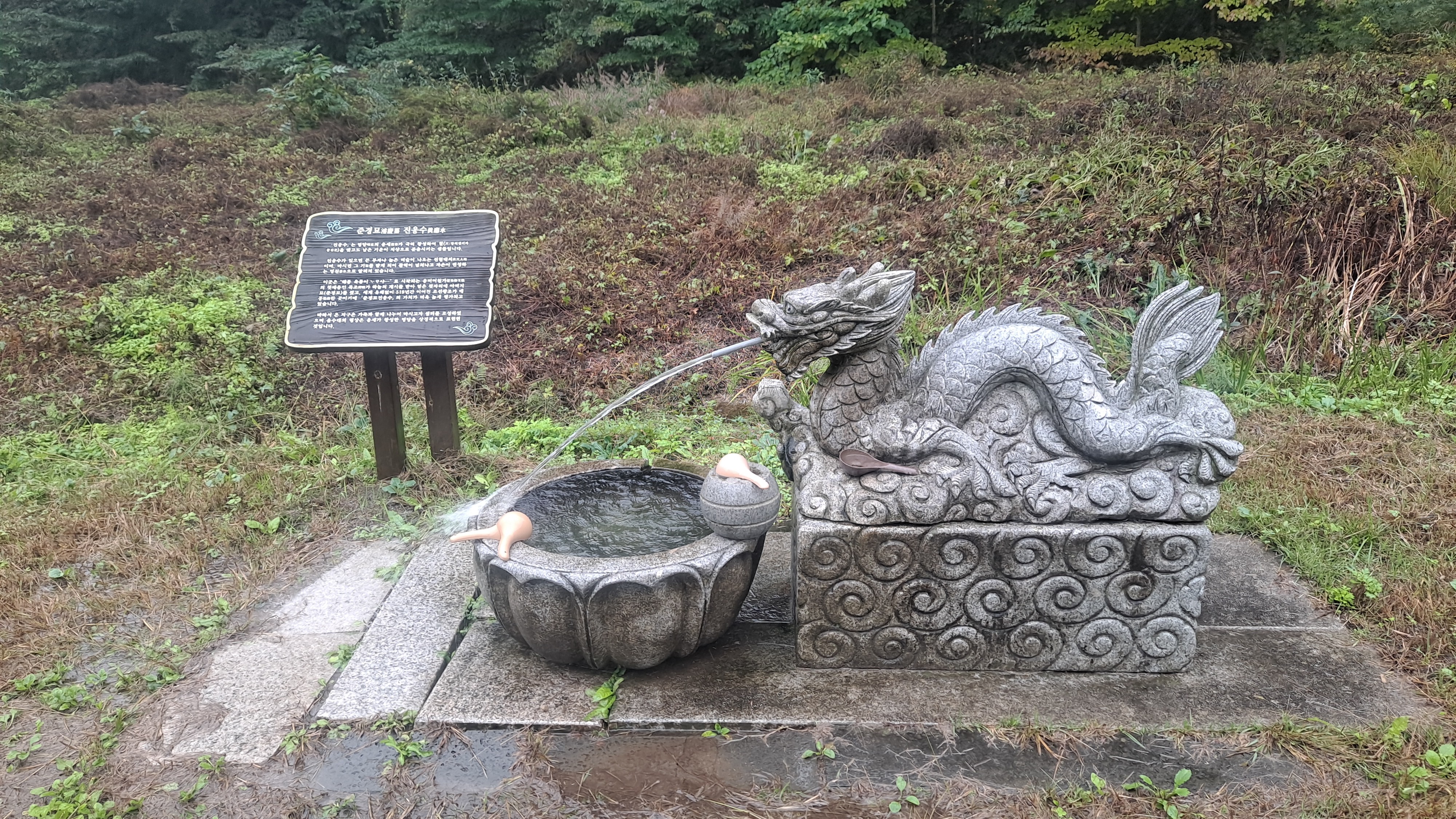 묘 앞에는 진응수(眞應水)란 표지판이 있고 용의 입에서 물을 뿜는 형상이다. 진응수란 명당의 기운이 왕성하여 혈을 맺고 남은 기운이 지상으로 분출하여 생기는 샘물이라는 설명이다. 더불어 이 물을 마시면 활력이 넘칠 뿐 아니라 자손이 번창한다고 하니 누구라도 마시지 않을 수 없다.