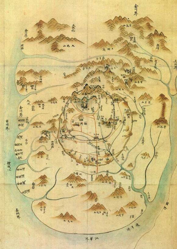 (3) 國內城 170도/3회/3라성 중국 길림성 집안에 위치한 고구려의 두 번째 도읍지이다. 압록강과 통구강 두 강이 합수되는 지점이며, 각각의 강 중심에는 섬이 있어 물의 흐름을 단속하는 형태다. 특히 압록강에 있는 벌등도는 통구강의 수세를 이중으로 단속하는 모습이니, 소위 말하는 물 샐 틈 없는 지세라 할 수 있다. 이와 같은 江中의 섬을 羅星이라 하며, 물의 흐름을 저지하는 매우 귀한 水口砂이다.