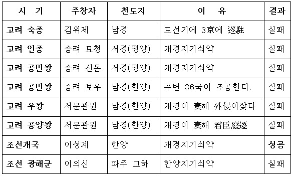3. 遷都論議 사례 참고적으로 정치적 이유로 천도하려 했던 사례를 살펴보면 조선이 易姓革命에 의한 한양으로의 천도 외에는 모두 실패하였다.