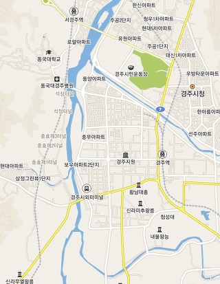 (5) 경주 140도/8회/2라성 신라 천년의 도읍지로서 서라벌 또는 계림으로 불렸으며, 불국사와 석굴암 등 수많은 문화유적이 남아있는 곳이다. 보문호에서 흘러온 북천과 반월성을 끼고 도는 남천이 만나 형산강을 이루는 지점에 古都가 형성되었다. 경주는 형산강의 물이 크게 환포한 것은 아니지만, 궁성인 반월성을 중심으로는 남천의 물길이 갑자기 꿈틀대고 있다. 특이한 것은 형산강의 중심에 마치 수달 같은 모습의 섬이 머리와 꼬리가 뚜렷하여 상류로 오르는 모습인데, 마치 세 곳의 물을 길목에서 동시에 제어하는 것과 같다.