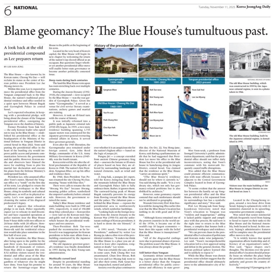 지대표는 “조선 시대부터 한국전쟁(1950~53)에 이르는 외세 침입의 역사와 여러 대통령들의 불운한 말로(末路)를 떠올려 보면 이 자리를 길한 땅이라고 보기는 어렵다”고 말했다.