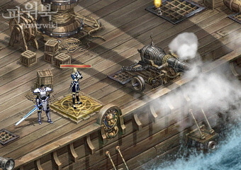 몬스터 사냥이 끝나고 스테이지 중간이 되면 적함과의 전투가 시작되는데, 이때 파티 리더(스크린샷의 요정)은 반드시 금색 발판 위에 위치하고 있어야 한다. 그래야만 함포를 이용한 공격과 보호 주문을 통한 방어를 수행할 수 있기 때문이다.