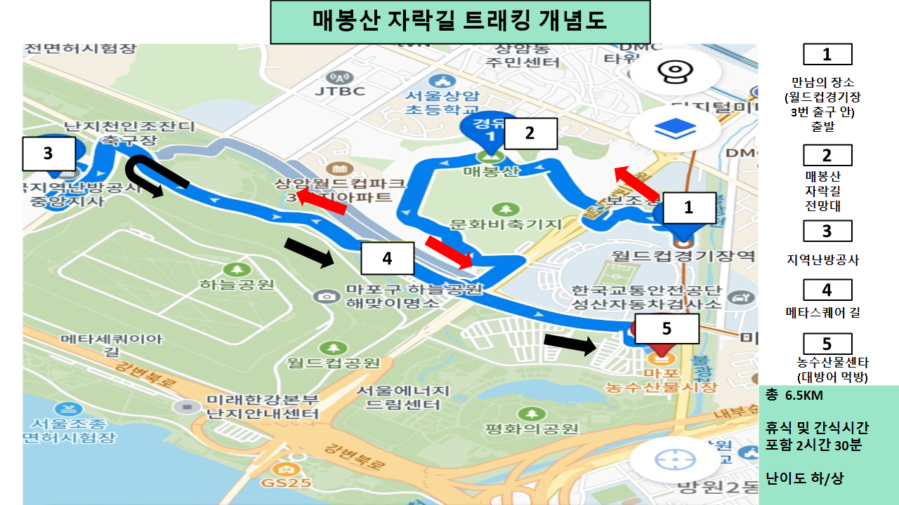 월드컵 경기장역(6호선) 3번 출구 → 1차 출발장소(인원점검 및 준비운동)