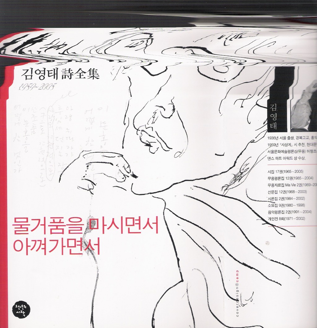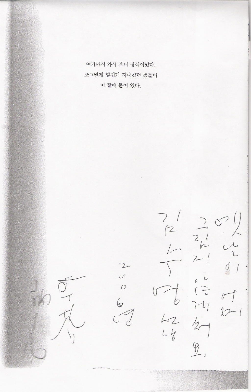 김영태 화백은 또한 시인이며 무용, 음악 평론가로서 위의 시집 '물거품을 마시면서 아껴가면서'를 나에게 주면서 죽기전 마지막으로 책 뒷장에 사인해 주셨다. 그 사인을 아래에 공개한다. 워낙 유명한 예술가라 영광으로 생각하고......그 후 몇달후 이 세상을 타계하셨다. 위 표지 그림 오른 쪽에 그의 약력이 적혀 있다. 2006년 4월이었는데 2006년 7월 12 일 돌아 가셨다.