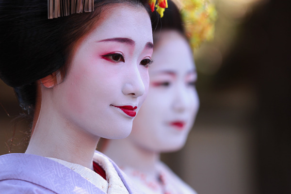 게이샤의 전통적인 모습으로 떠올리는 흰 화장과