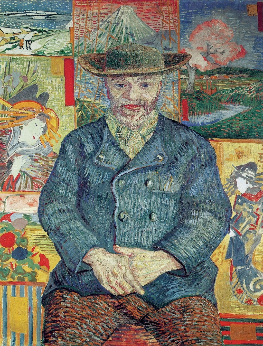 고흐의 '탕기(Tanguy) 할아버지'라는 작품의 배경에 우키요에가 그려져 있는 모습