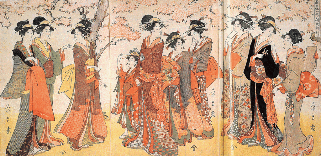 우키요에는 처음에는 마을의 일상 생활, 특히 유곽의 어여쁜 창부들, 스모 역사들과