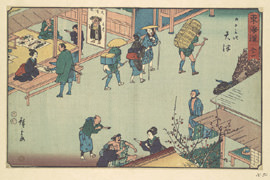 히로시게의 작품으로 보이는 우키요에를 들여다보고 있습니다.
