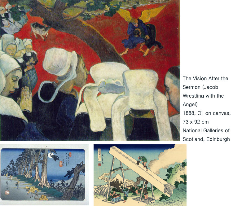 고갱의 특징인 평탄성과 감정을 표현하는 색채는 위에 설명한 것과 마찬가지입니다.