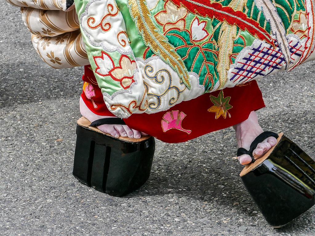 높은 굽의 게다에 맨 발