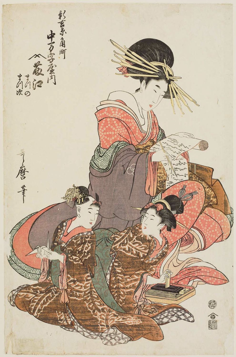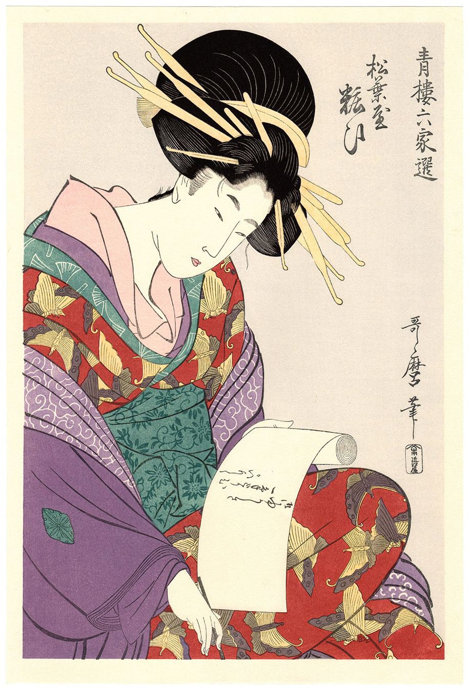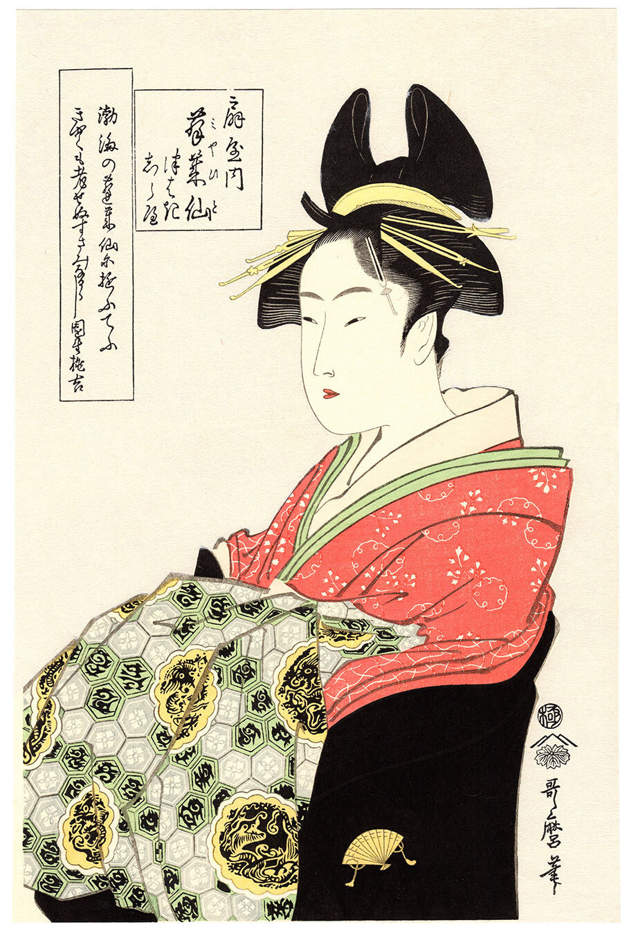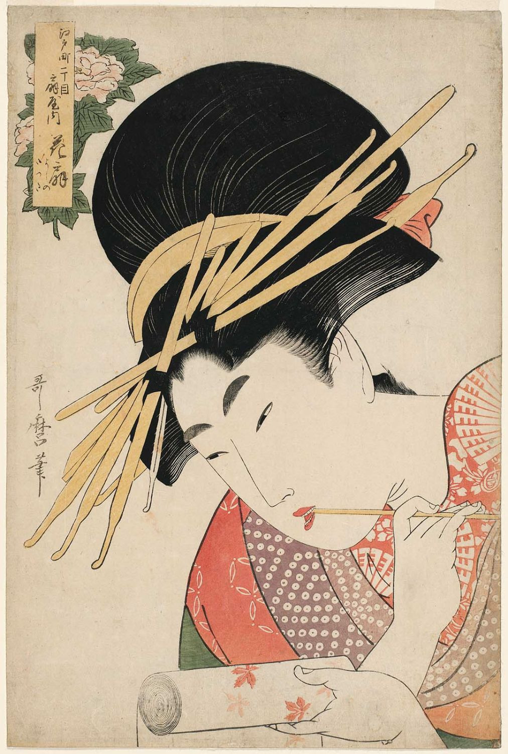 Kitagawa Utamaro가 그린 미인화 : 이곳에도 마찬가지로 옥호와 오이란의 이름이 적혀있다