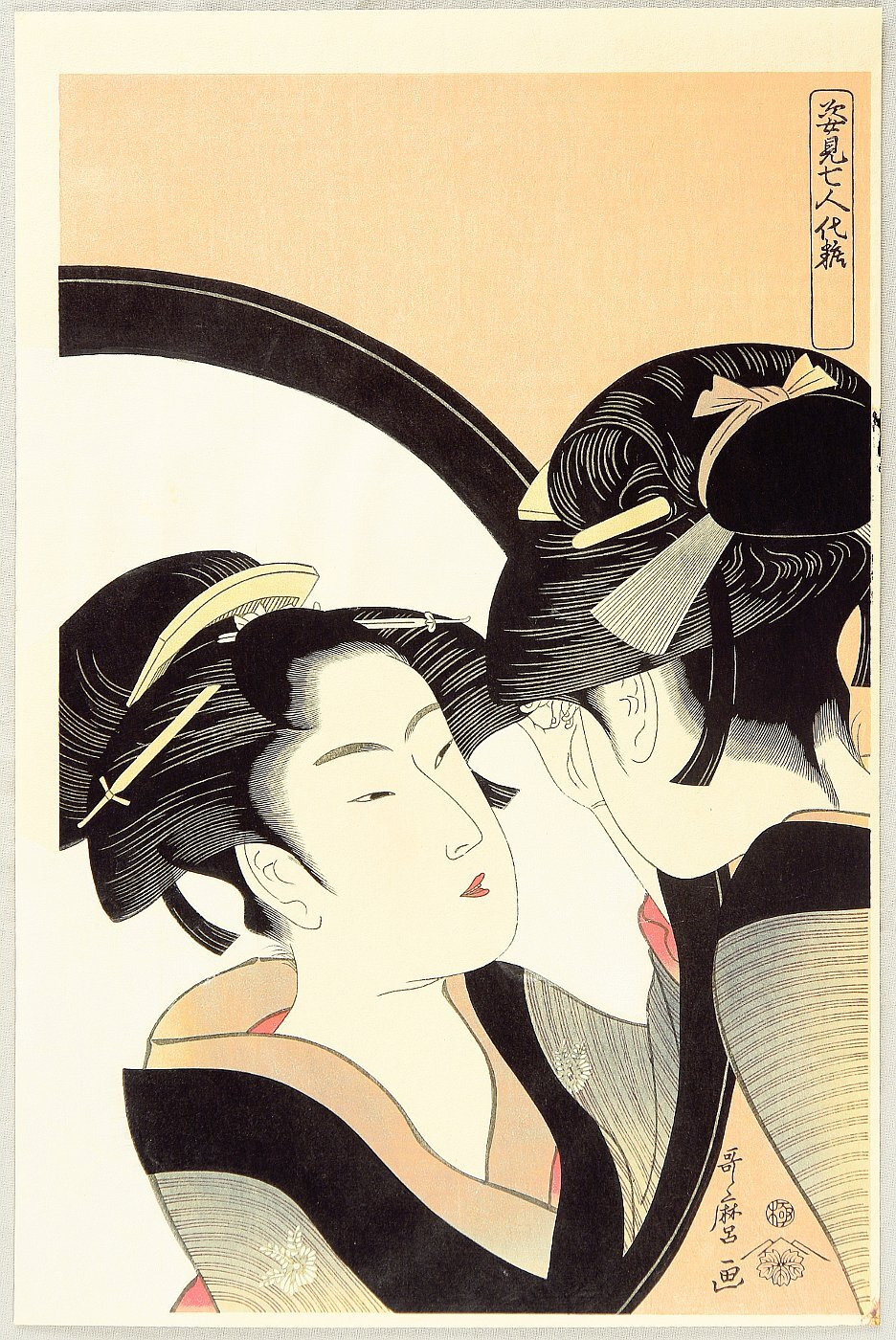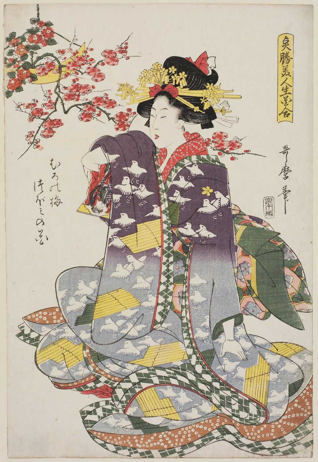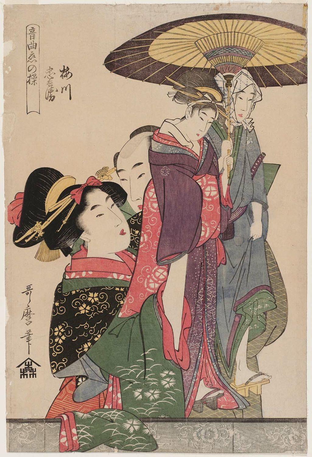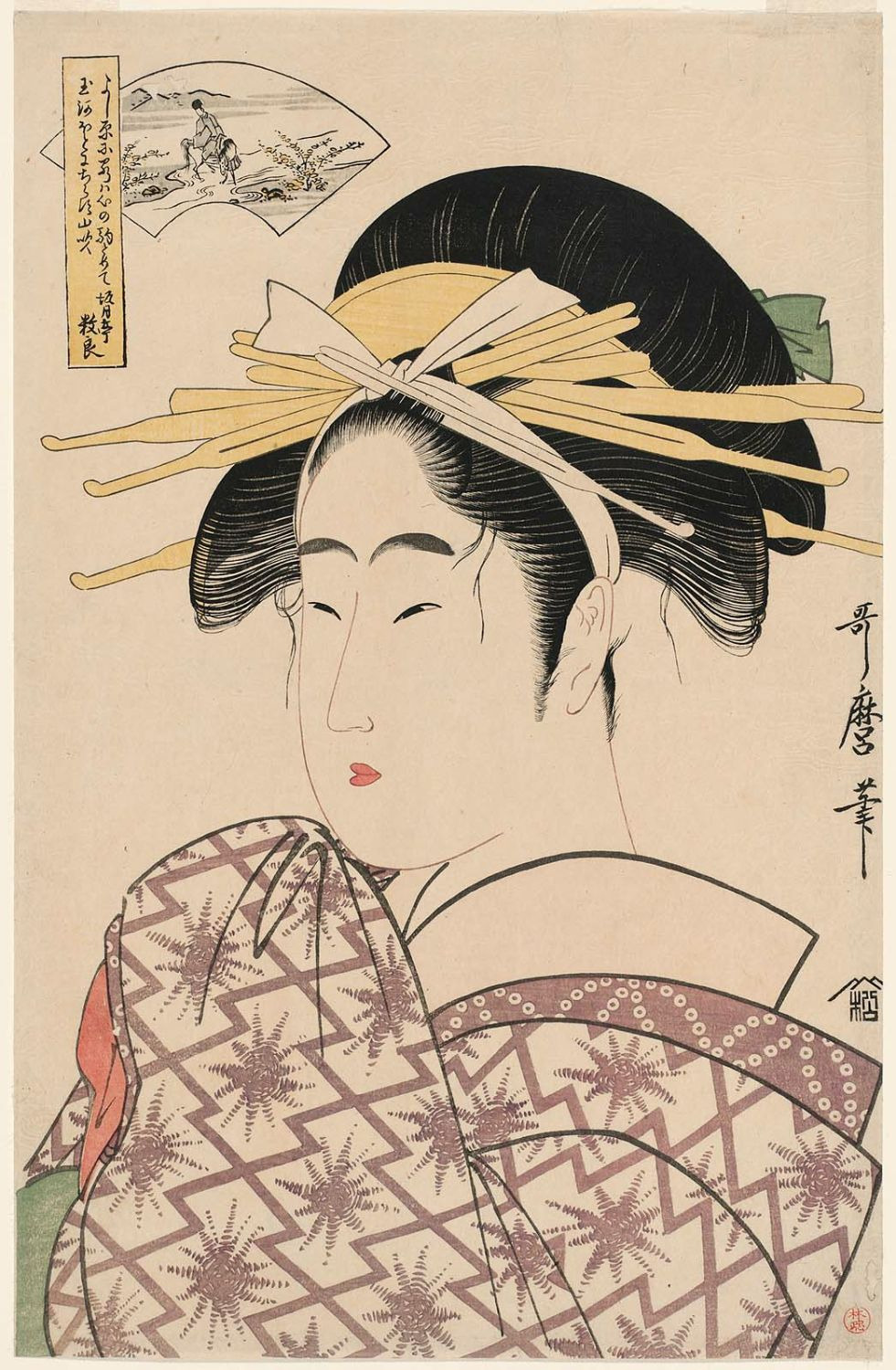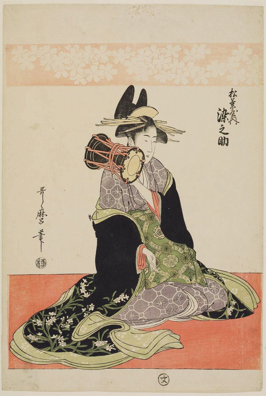 Kitagawa Utamaro가 그린 미인화 : 이곳에도 마찬가지로 옥호와 오이란의 이름이 적혀있다