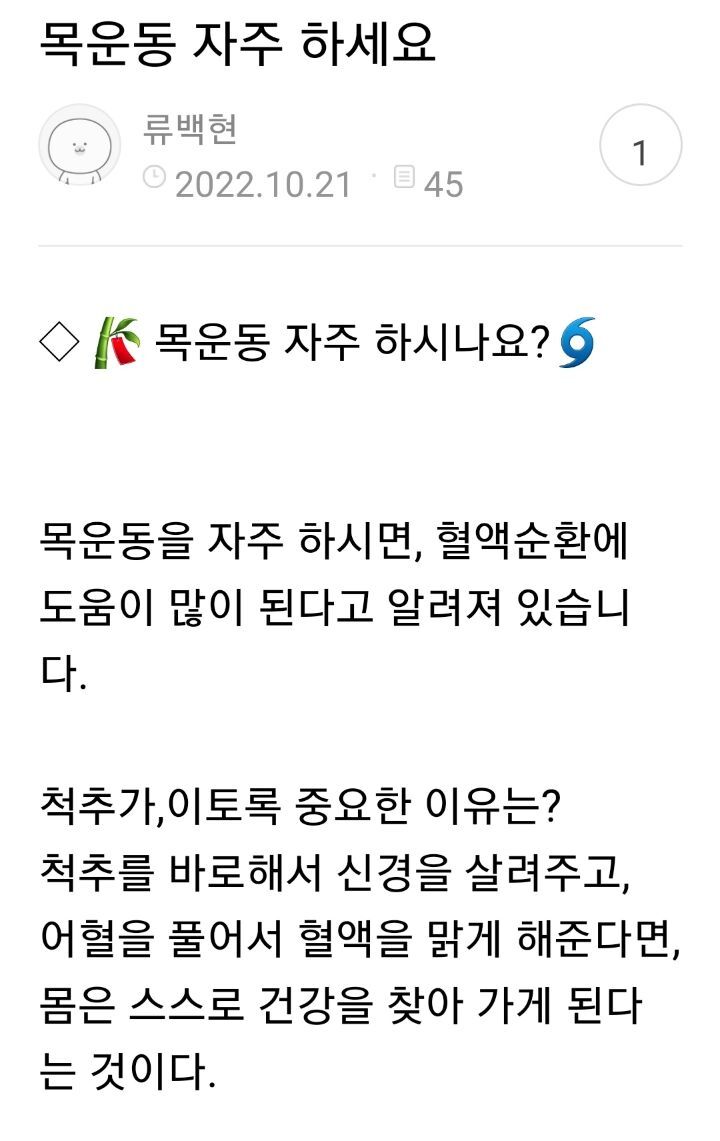 목운동 자주 하세요 작성자정고은|작성시간22.10.22|조회수122 목록 댓글 10 글자크기 작게가 글자크기 크게가 다음검색 현재 게시글 추가 기능 열기 북마크 공유하기 신고 센터로 신고 댓글 댓글 10 댓글쓰기 답글쓰기 댓글 리스트 작성자백만송이 | 작성시간 22.10.22 좋은정보 감사합니다 작성자조은희 | 작성시간 22.10.22 나도 목이 좀 이상했는데 도리도리열심히 해야겠어요좋은정보 감사해요정고은친~ 작성자정고은 작성자 본인 여부 작성자 | 작성시간 22.10.22 온수탕에서 하면 더 좋겠습니다 작성자이쁜용 | 작성시간 22.10.22 쉬운거 같으면서도 안되네요 작성자희숙 | 작성시간 22.10.23 좋은글 잘보고갑니다.즐거운휴일되세요. 댓글 전체보기