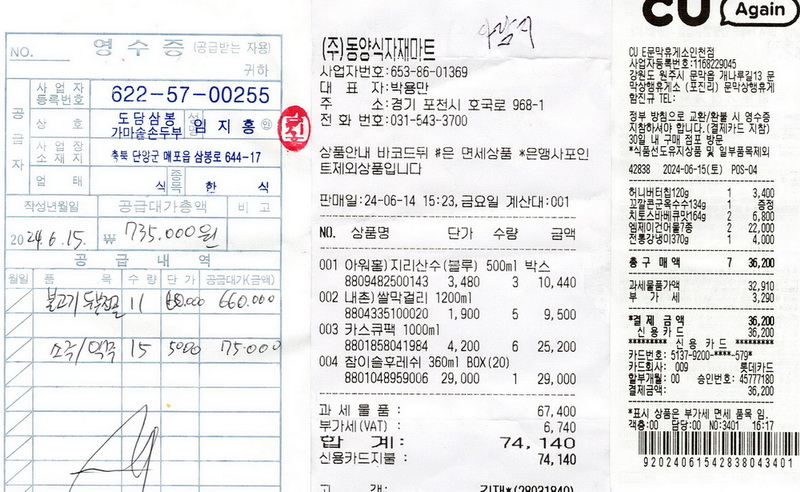 - 차내 주류,생수 : 74,140원 (영수증 참조)