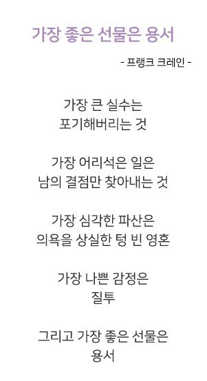 가장좋은 선물은 용서 작성자다빈이|작성시간19.11.16|조회수366 목록 댓글 2 글자크기 작게가 글자크기 크게가 프랭크 크레인 다음검색 현재 게시글 추가 기능 열기 북마크 공유하기 신고 센터로 신고 댓글 댓글 2 댓글쓰기 답글쓰기 댓글 리스트 작성자찬미 | 작성시간 19.11.16 가장좋은 선물은 용서~ 작성자매화향기 | 작성시간 19.11.16 질투가 가장 나쁜건데왜 사람들은 질투를 할까... 댓글 전체보기