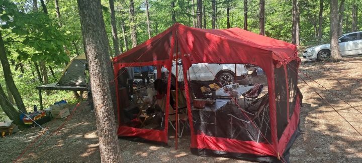 함께 모여 식사를 준비하기 위해 대형 막사 타프를 설치