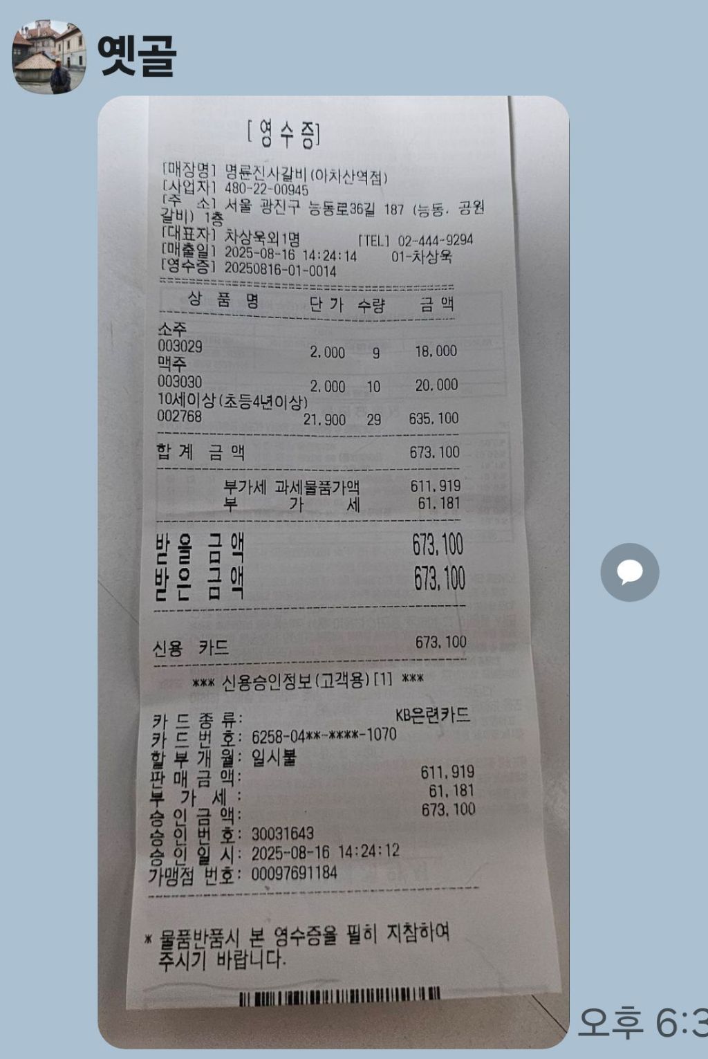 지출 : 673.100원 (명륜진사 갈비 식사와 음료)
