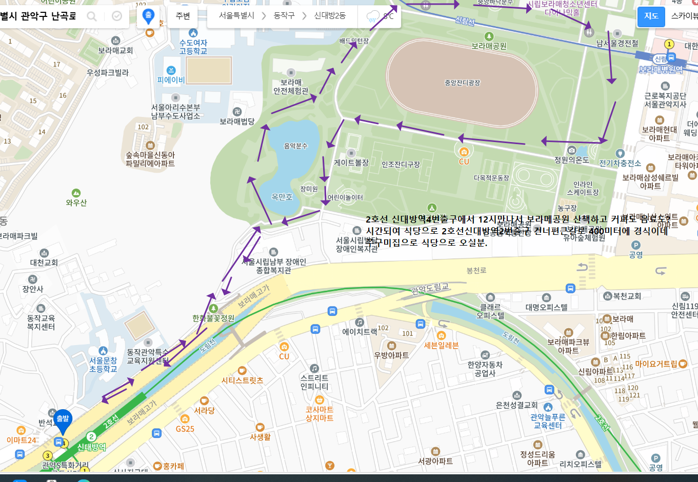 ↑. 4번출구에서 보라메 공원 탐방하고 식당으로갑니다,. ↓