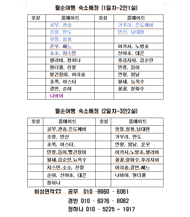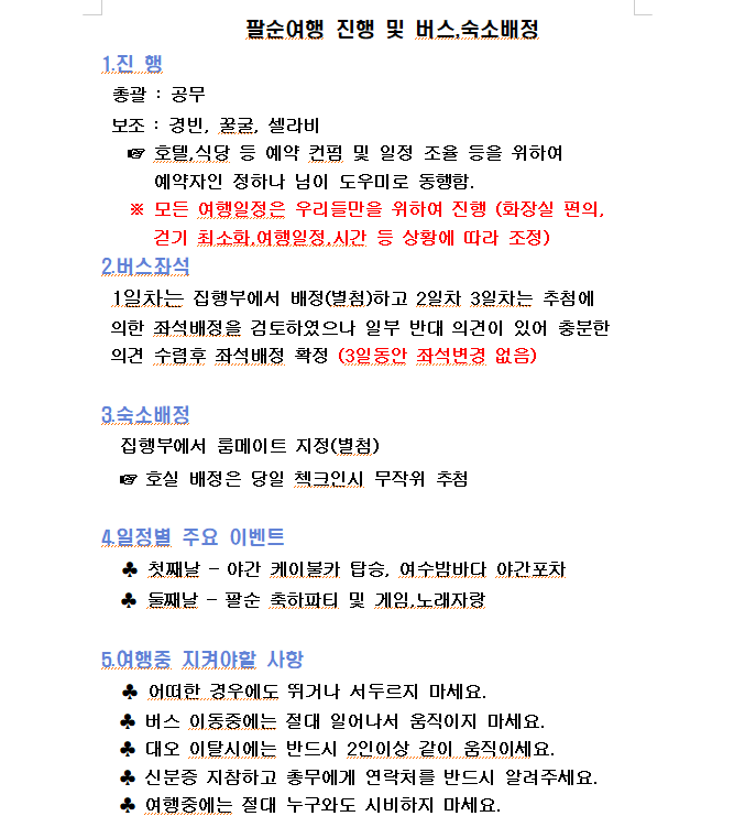 이제 거의 준비를 마쳤습니다. 그러고 나니 또 가장 골치아픈 버스좌석 및 숙소배정이