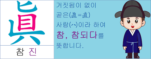 한문으로는 진(眞)을 의미하며 순수함과 정신적인 의미까지 포함되는 함축적 의미를