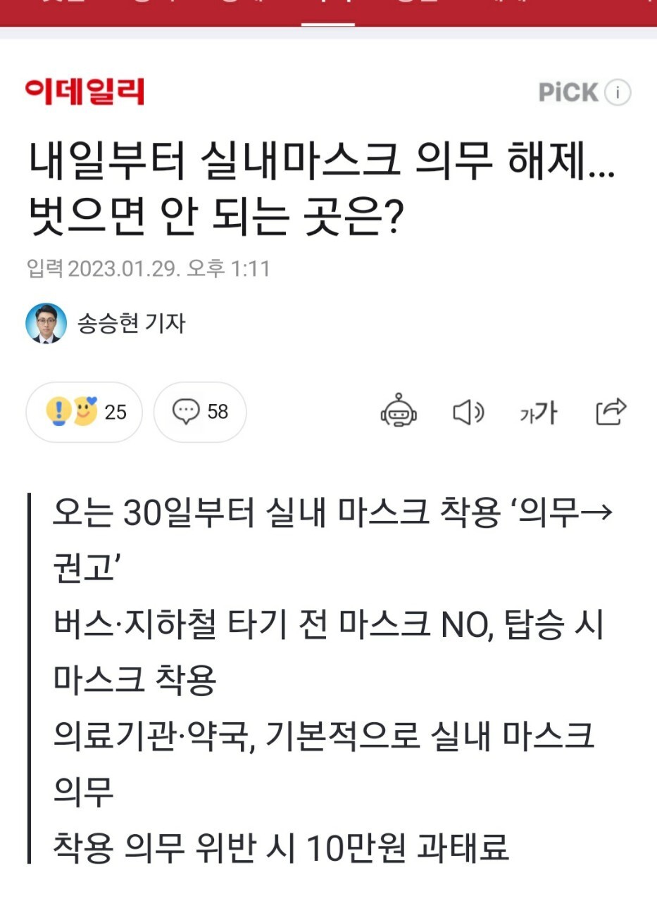 <내일부터 실내마스크 의무 해제>벗으면 안 되는 곳은? 작성자미션|작성시간23.01.29|조회수89 목록 댓글 2 글자크기 작게가 글자크기 크게가 다음검색 현재 게시글 추가 기능 열기 북마크 공유하기 신고 센터로 신고 댓글 댓글 2 댓글쓰기 답글쓰기 댓글 리스트 작성자감바 | 작성시간 23.01.30 _()_ 작성자헌 터 | 작성시간 23.01.31 정보감사 댓글 전체보기