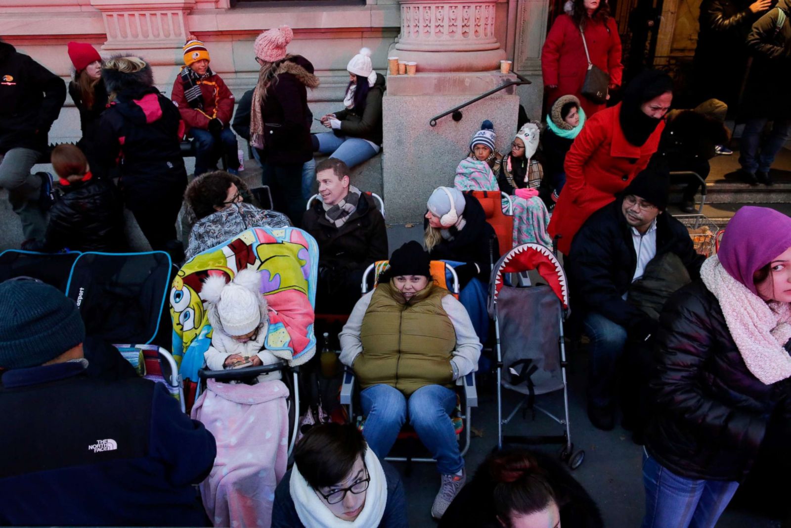 명당을 차지하기 위해 6시경의 이른 시간부터 사람들이 메이시스 퍼레이드 루트를 따라 줄을 서곤 합니다.