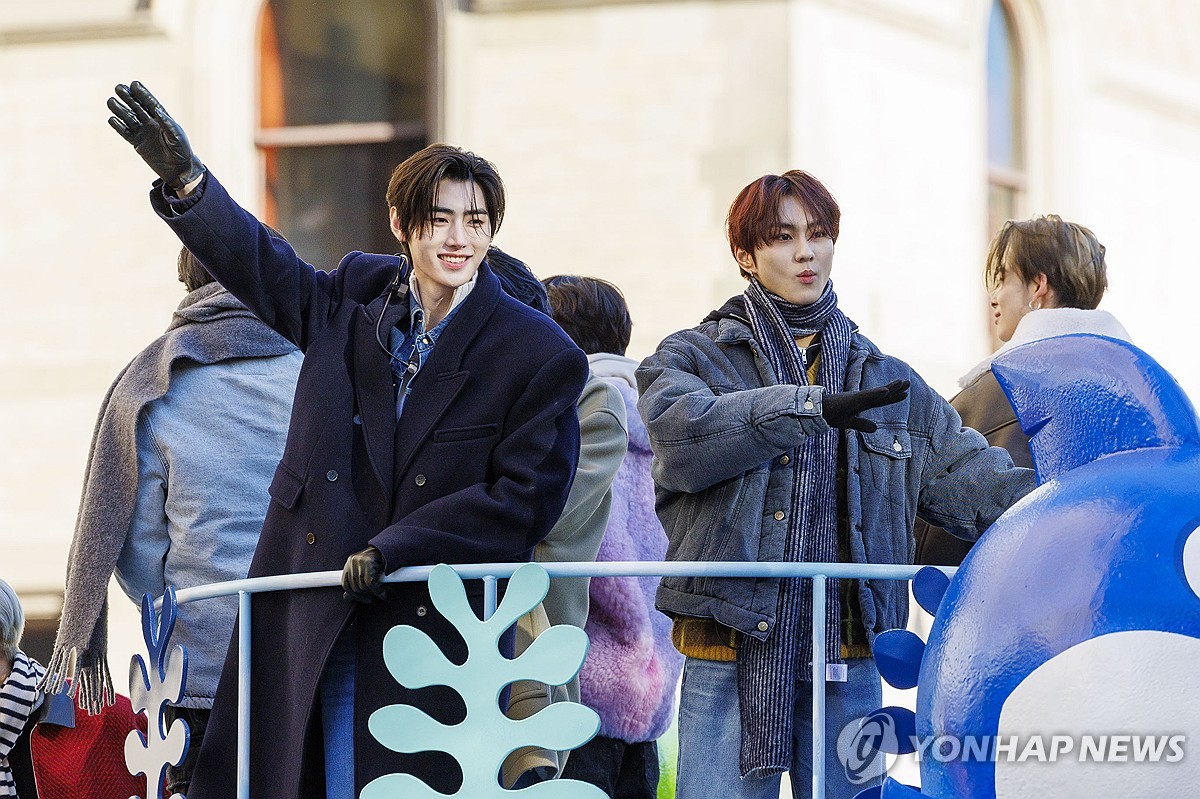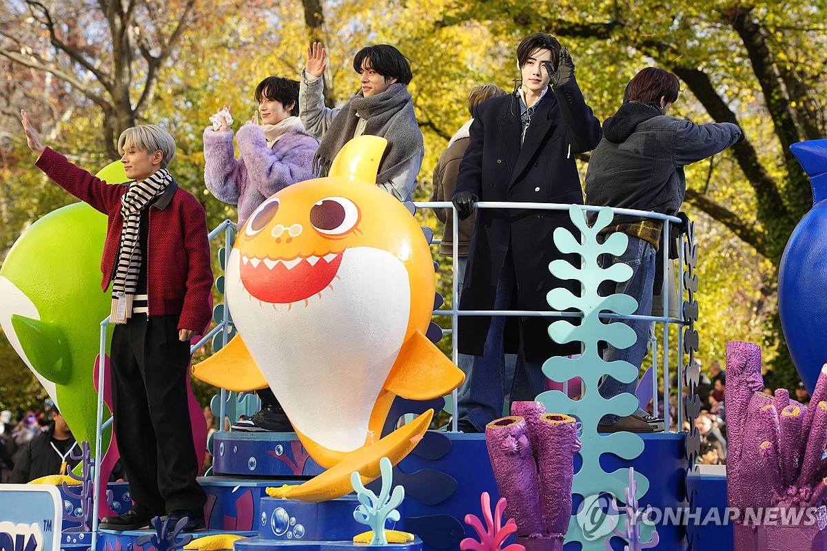 ENHYPEN band members ride the Baby Shark float