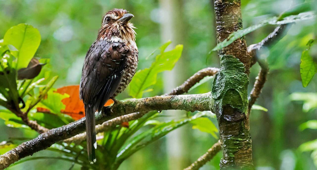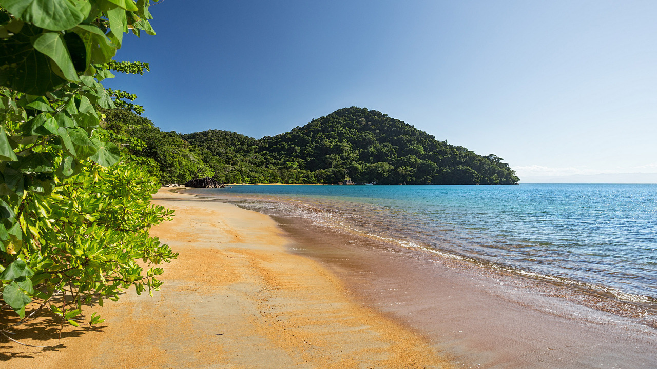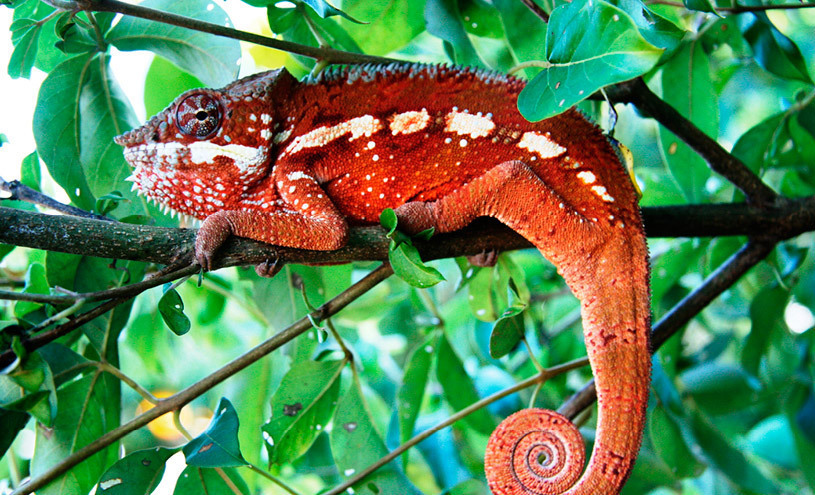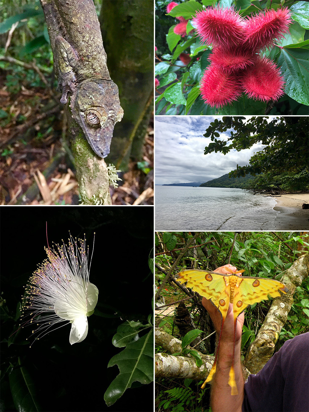 왼쪽 위부터 시계 방향으로: 1) Nosy Mangabe Malee Oot의 잎꼬리도마 뱀붙이; 2) achiote 또는 립스틱 나무 (Bixa orellana) Malee Oot의 밝은 적분홍색 종자 꼬투리 ; 3) 해변© 의 잔잔한 바닷물 Malee Oot; 4) 혜성 나방 Christian Boix; 5) 카디널 하트 플라워 © Andy Haines