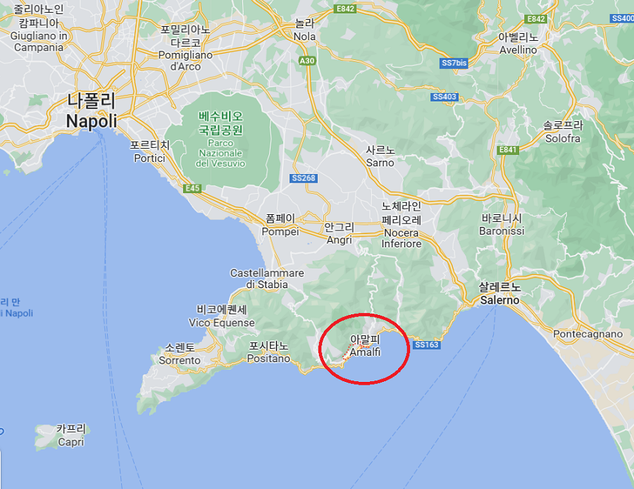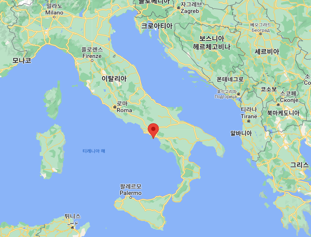 나폴리에서 남쪽으로 70km, 살레르노에서 서쪽으로 20km 지점에 위치한