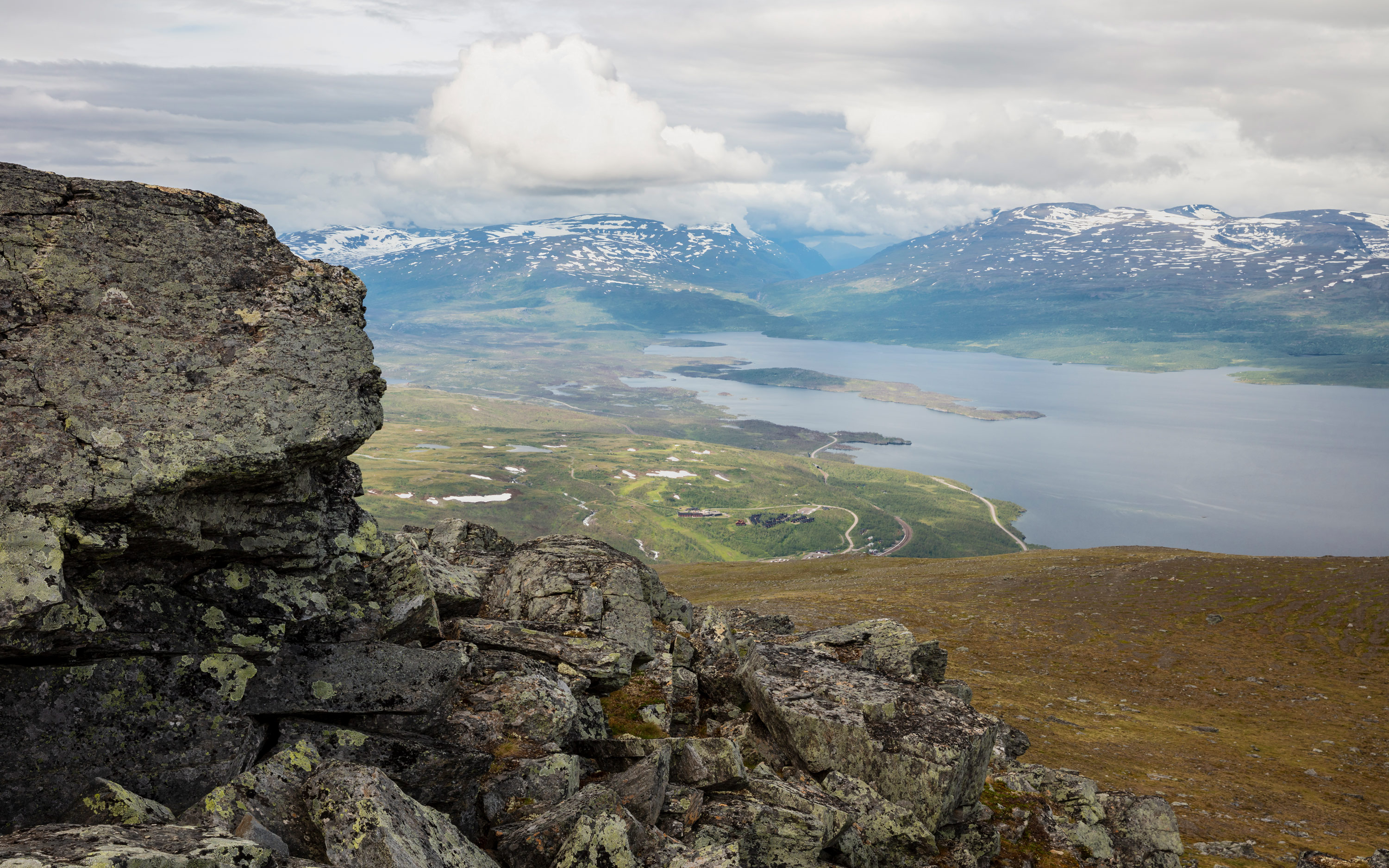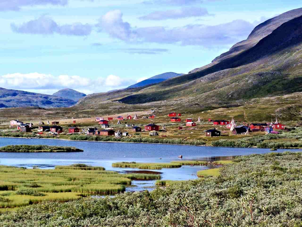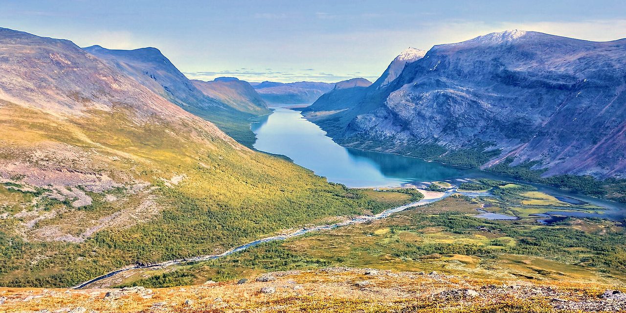 장엄한 산들이 꽃이 만발한 고산 초원, 그림 같은 급류, 스칸디나비아에서 가장 큰 고산 호수가 있는