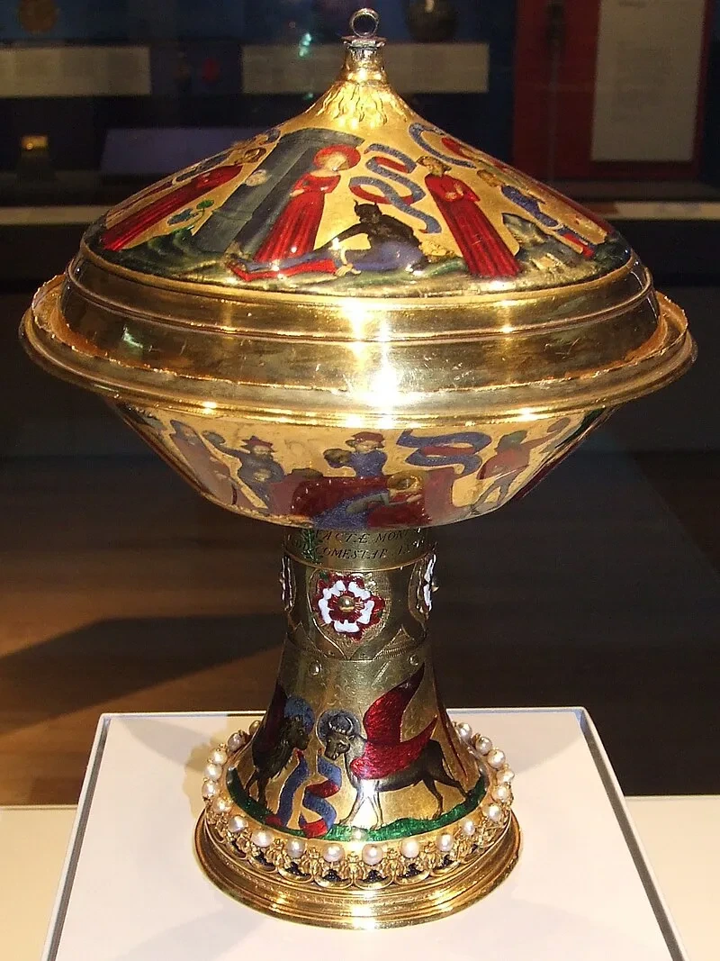 뚜껑은 커다란 꽃무늬 깃으로 장식되어 있으며, 그 위에는 붉은 가죽이 교차되어 있으며,