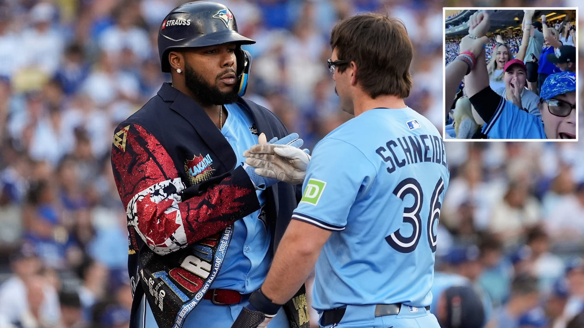 연타석 홈런을 치고 홈에 들어와 홈런타자재킷을 입은 블라디미르를 축하하는 슈나이더 선수