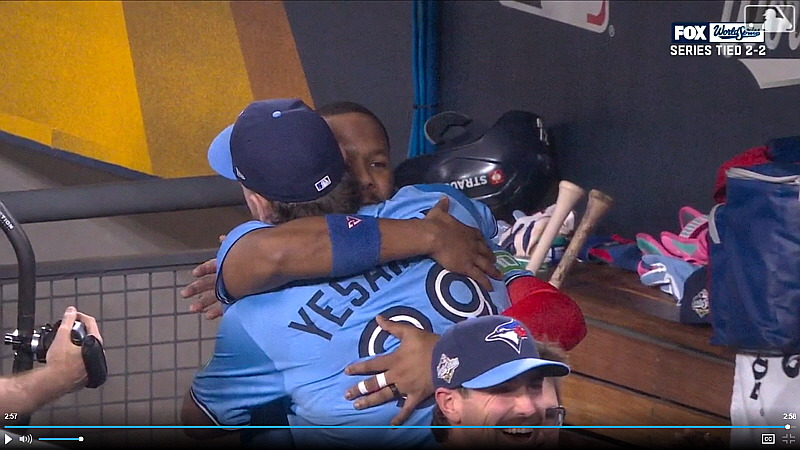 이어서 덕아웃 끝쪽에서 기다리고 있던 블라디미르 게레로 선수와 끌어안는 예세비치 투수