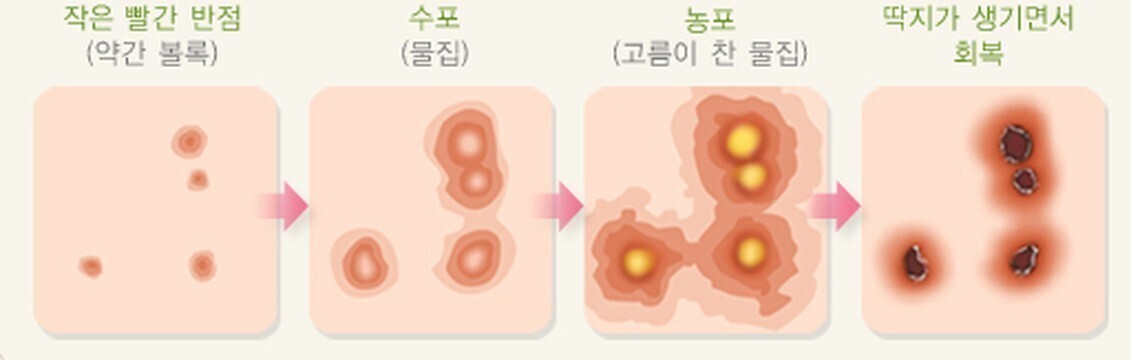 발진이 생기면 하루 안에 물집이 잡힌다. 2~3일 뒤에는 농이 생기고, 일주일 정도 지나면 딱지가 앉는다. 물집이 터지는 과정에서 2차 세균감염이 되는 경우도 있어 주의해야 한다. 딱지가 생긴 후 다 아무는 데까지는 2주 정도 걸린다.