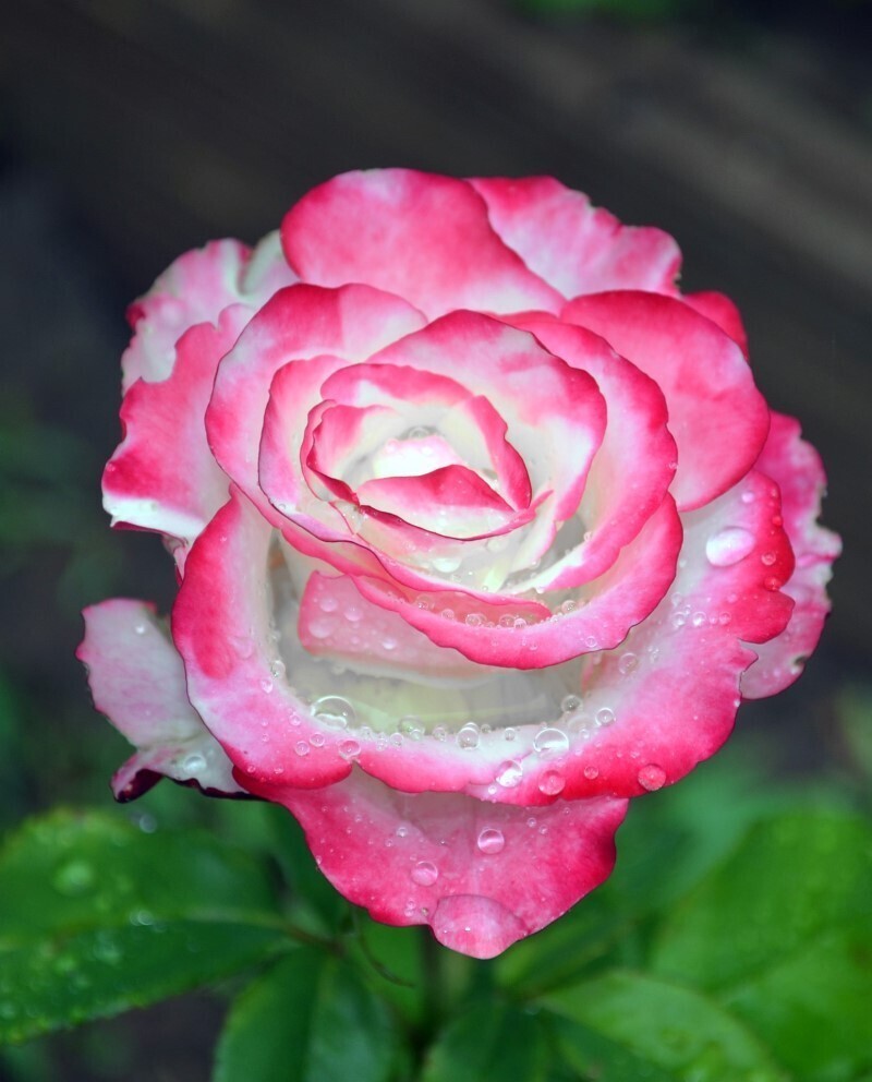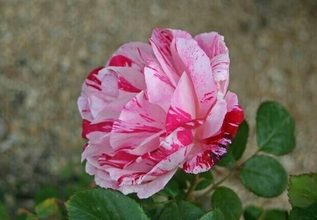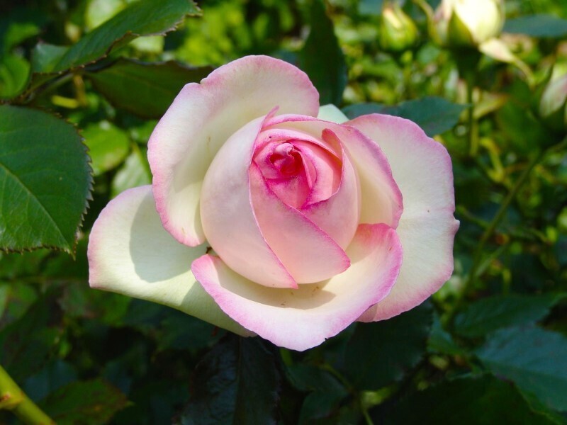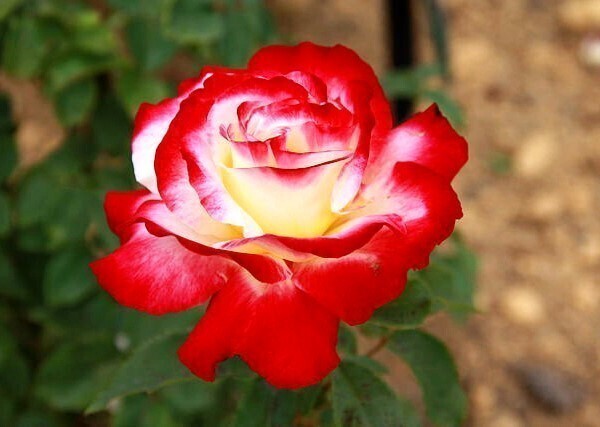 꽃 한송이에 흰색과 붉은색이 섞인 장미