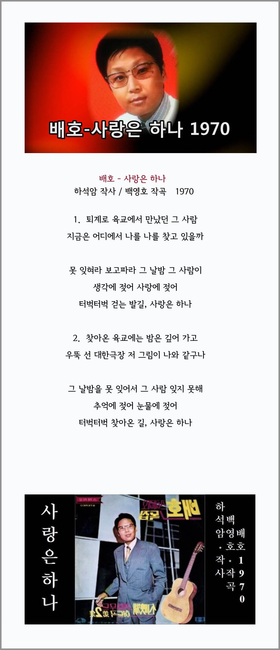 「사랑은 하나」는 작사에 하석암 님, 작곡에 백영호 님이 참여한 곡으로,
