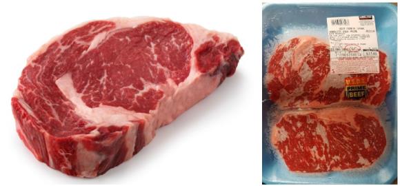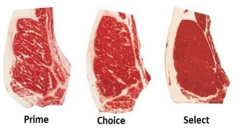 미국 농무부 (United States Department of Agriculture)에서 부여하는 소고기 등급입니다. 한국에서 한우를 1++ 등급부터 3등급까지 나누고 일본에서 5등급에서 1등급으로 나누듯 미국도 마트에서 판매하는 소고기를 세가지 등급으로 나누어 구분합니다. 등급은 고기와 지방의 분포(마블링)로 결정이 됩니다. 같은 소에도 지방이 많은 부위(머리 쪽)와 근육이 많은 부위(엉덩이 쪽)이 있어서 한 마리 소에서 세 가지 등급의 고기가 나올 수도 있습니다.