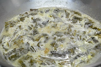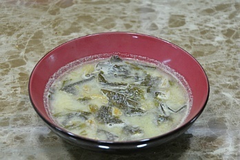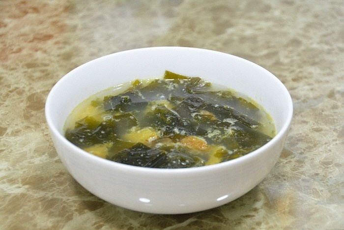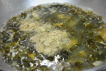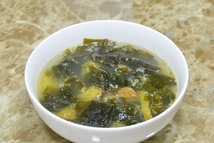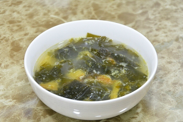 [재료] 불린미역 300그램, 황태 50그램, 물 2리터, 다진마늘 1숟가락, 생젓 3숟가락, 죽염