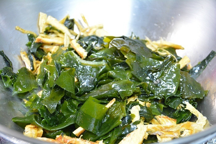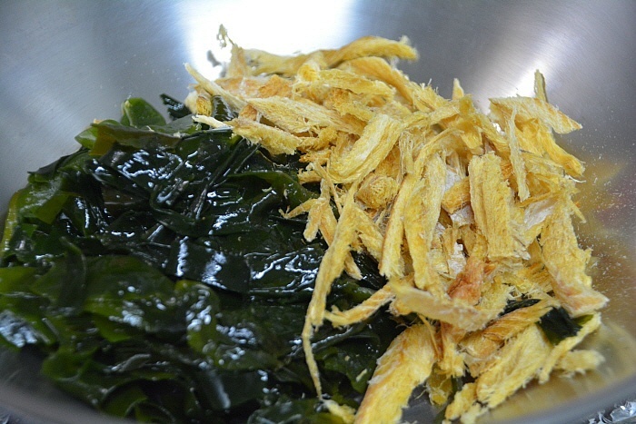 미역은 이미 불린것이라 해동하고, 황태는 먹기 좋게 짧은 길이로 잘랐습니다.