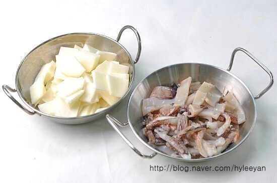오징어2마리, 무1/2개, 대파1대, 다진마늘1큰술, 고추장2큰술, 고춧가루1큰술,