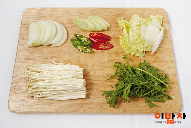 2. 양파는 채 썰고, 대파와 고추는 어슷 썰고, 배추는 3cm 폭으로 저며 썰고,