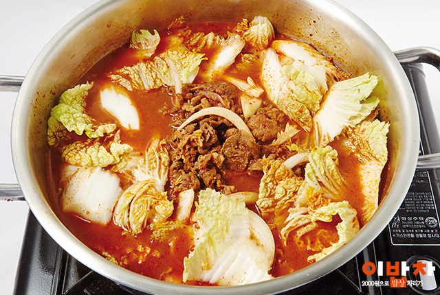 1분 정도 볶다가 배추와 육수를 넣어 끓이고,
