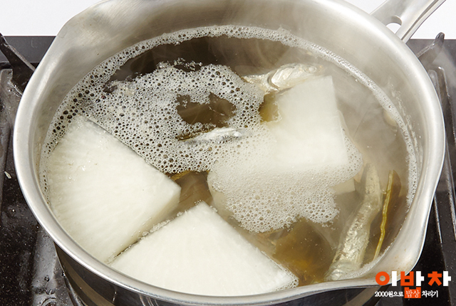 국물용 멸치(10마리), 다시마(1장=10X10cm), 무(1/2토막=75g)